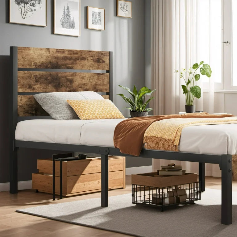 Bed - Twin Size Lifezone with Rustic Vintage Wood Headboard and Footboard, Metal Support, Rustic Brown - WM9.3.25