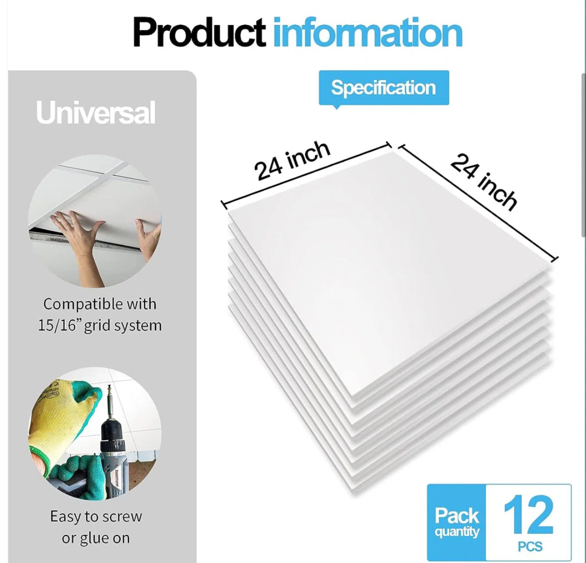 Ceiling Tile - Smooth White 12Pcs 2 ft. x 2 ft. PVC Drop Ceiling Tile,Smooth Square Wall Paneling (48 Sq.ft.) - WF11.7.25