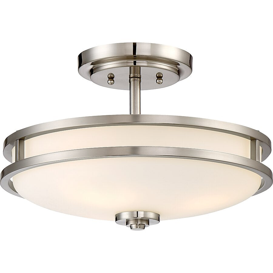 A clean design that is classic yet simple, the Cadet semi-flush mount features etched white glass that softly diffuses the flow of light. A pair of metal bands wrap around the glass shade, adding an element of industrial styling. Choose from old bronze or brushed nickel